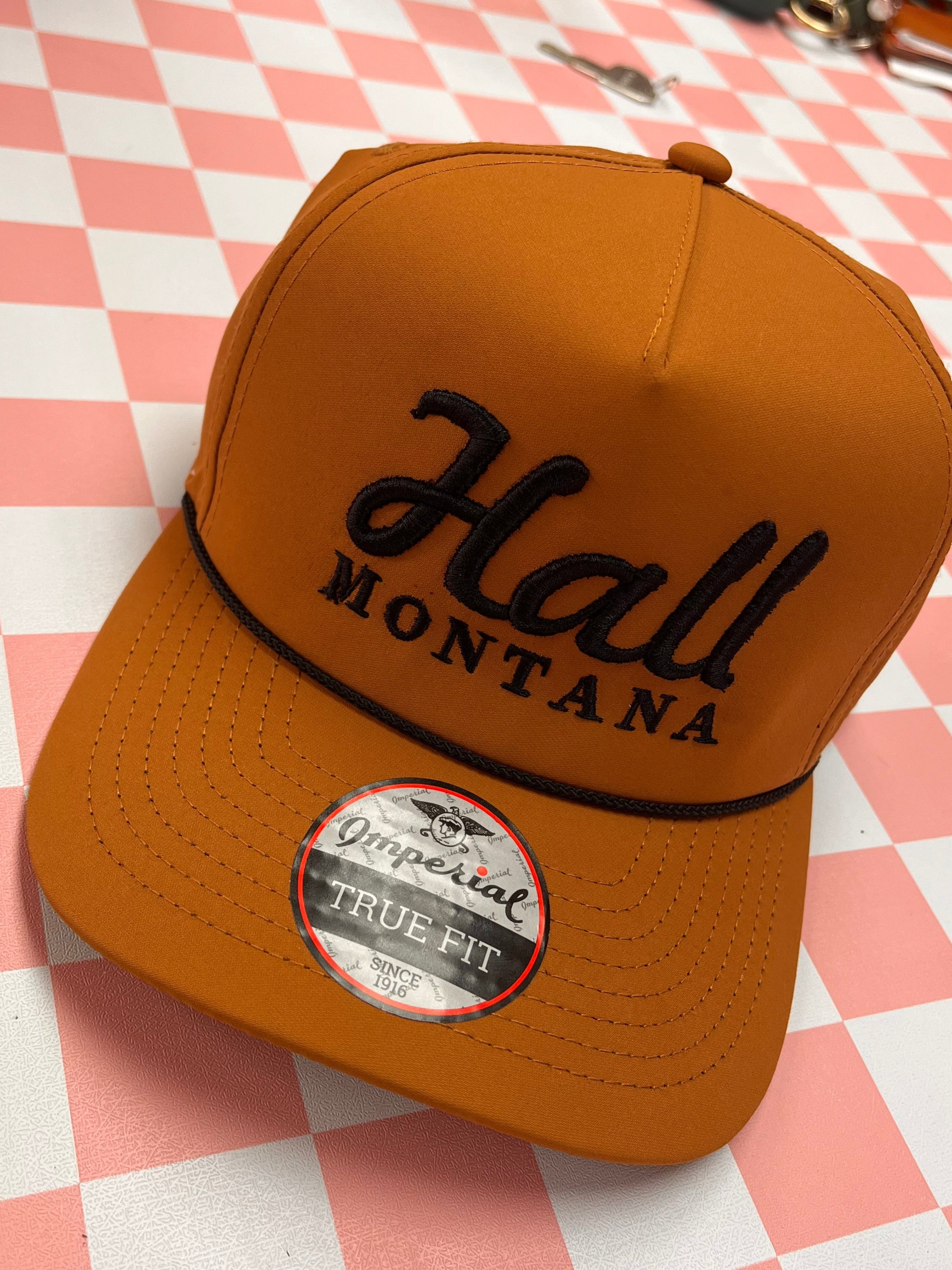 Add a touch of rustic charm to your look with the Hall Montana Hat. Featuring a warm brown color complemented by bold black embroidery spelling "HALL Montana," this hat delivers both style and personality. The imperial true fit ensures comfort, while the sleek black hat band adds a sharp finishing touch. Perfect for standing out with playful confidence wherever you go!