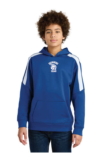 Sport Tek brand, royal and white youth hoodie with white Drummond Logo