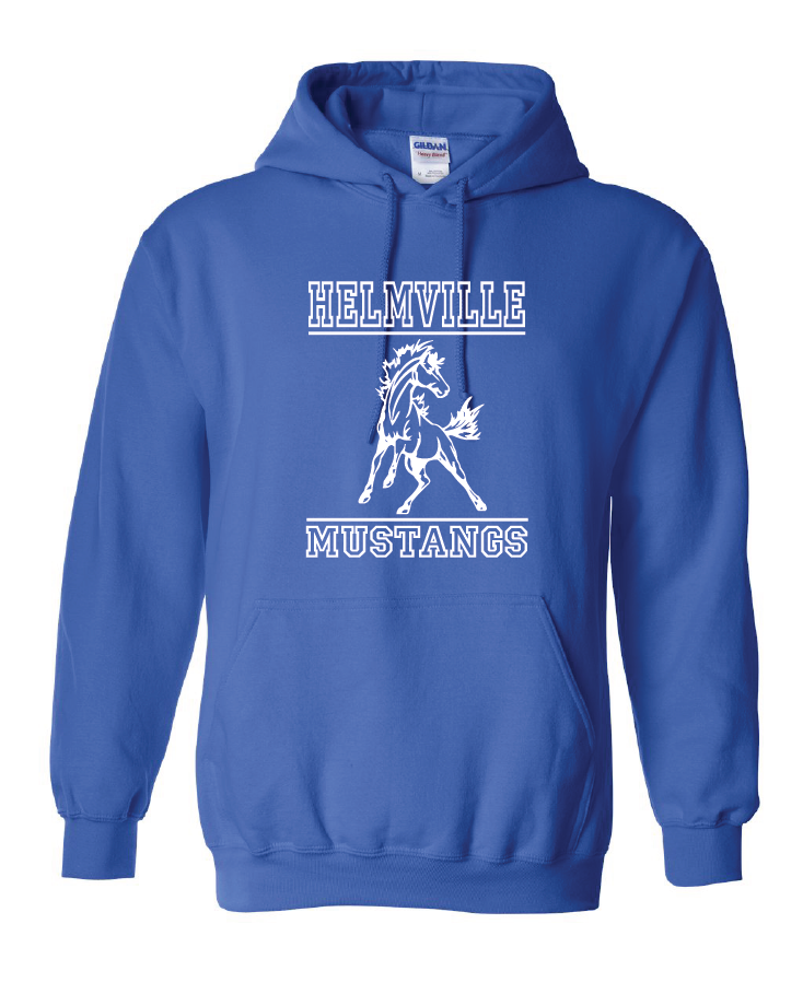 Gildan Heavyweight, blue or sport grey with Helmville Mustangs design
