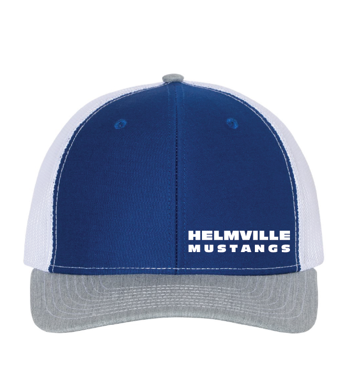 Richardson 112 black, blue/grey/white with Helmville Mustangs embroidered in black
