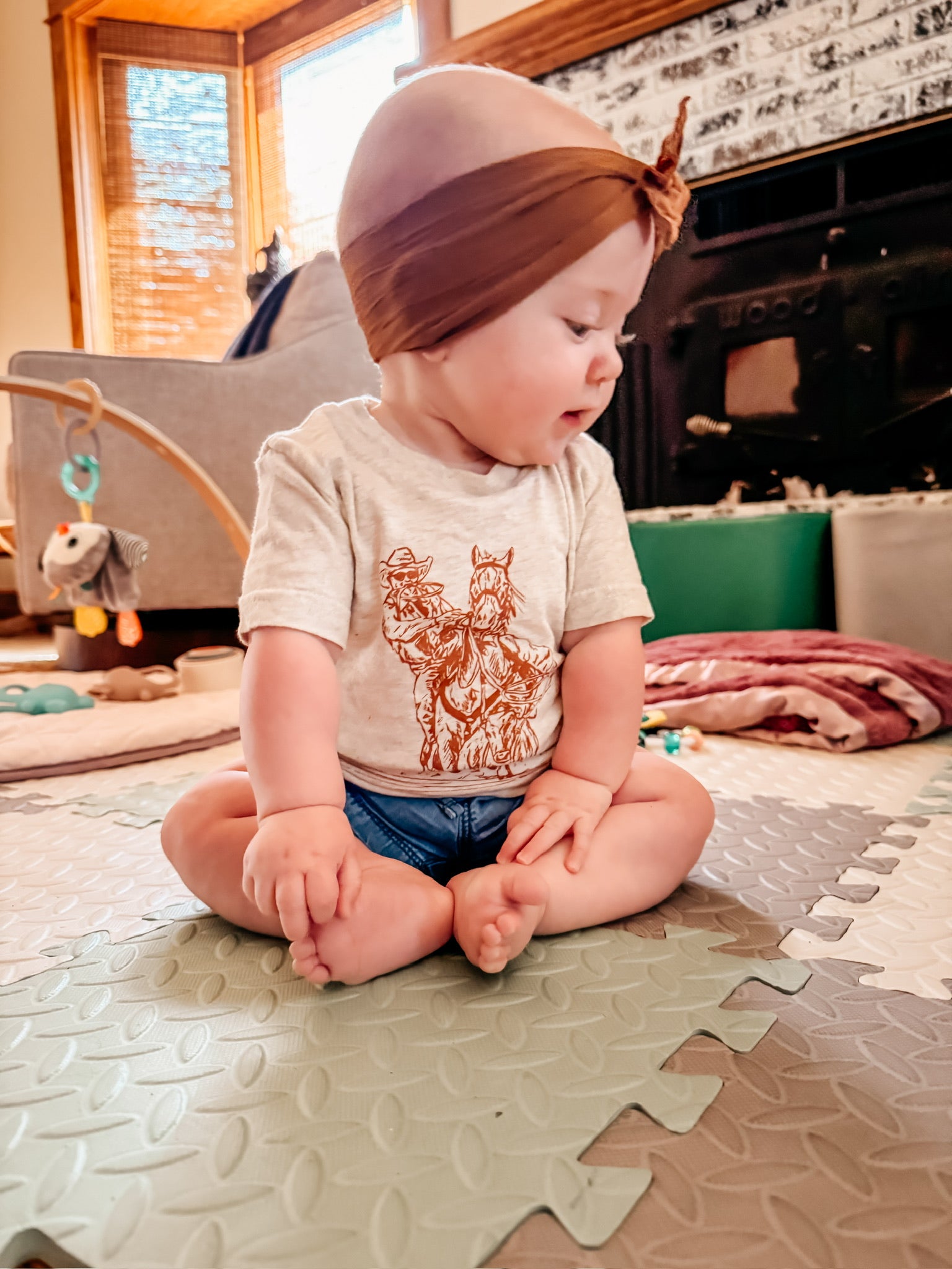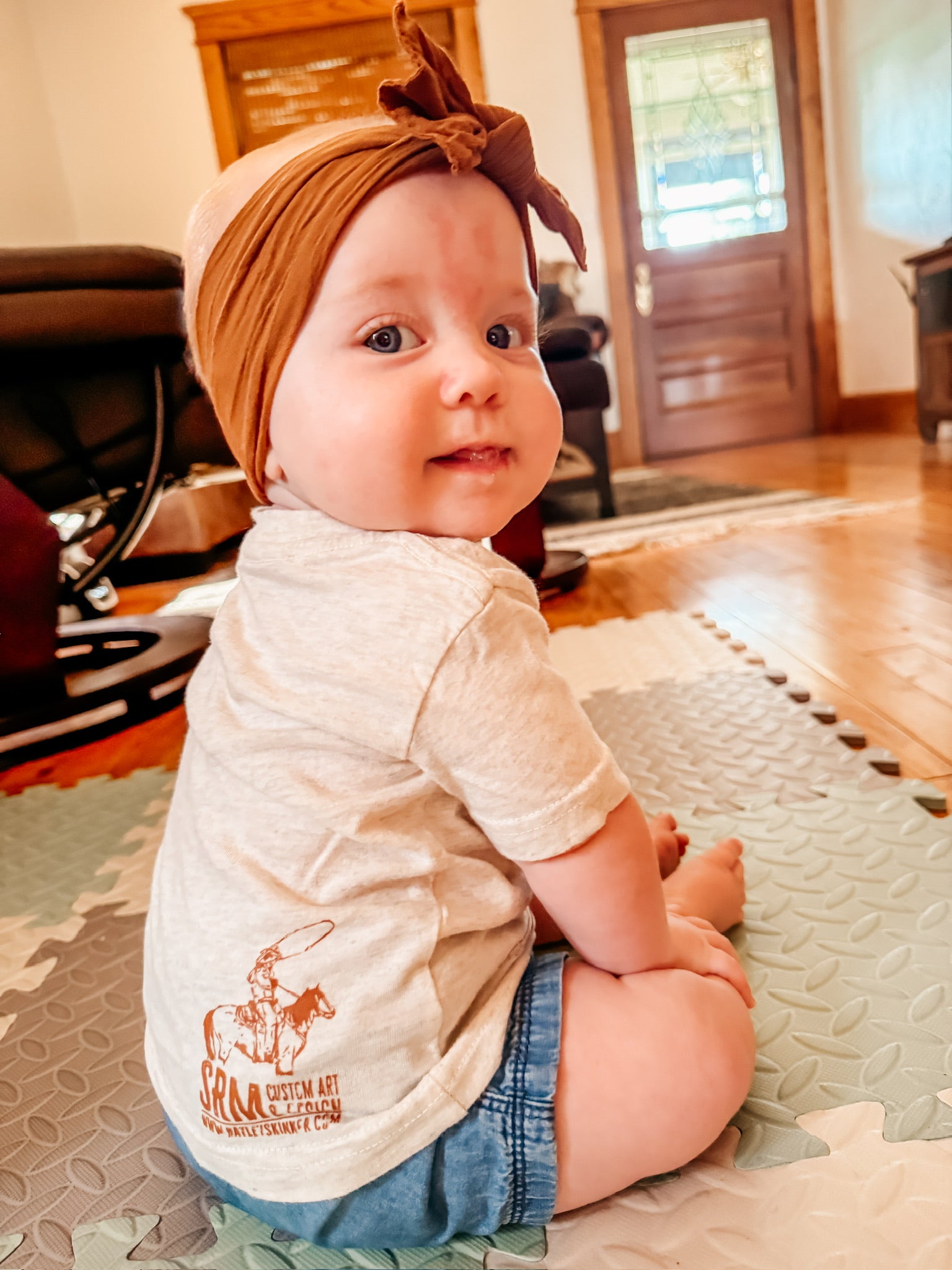Featuring the Sun Goes Up design with a tie-down roper in a burnt orange/brown on a heather natural t-shirt. These are tooooooo cute! For the lil cowboys and cowgirls in your life.