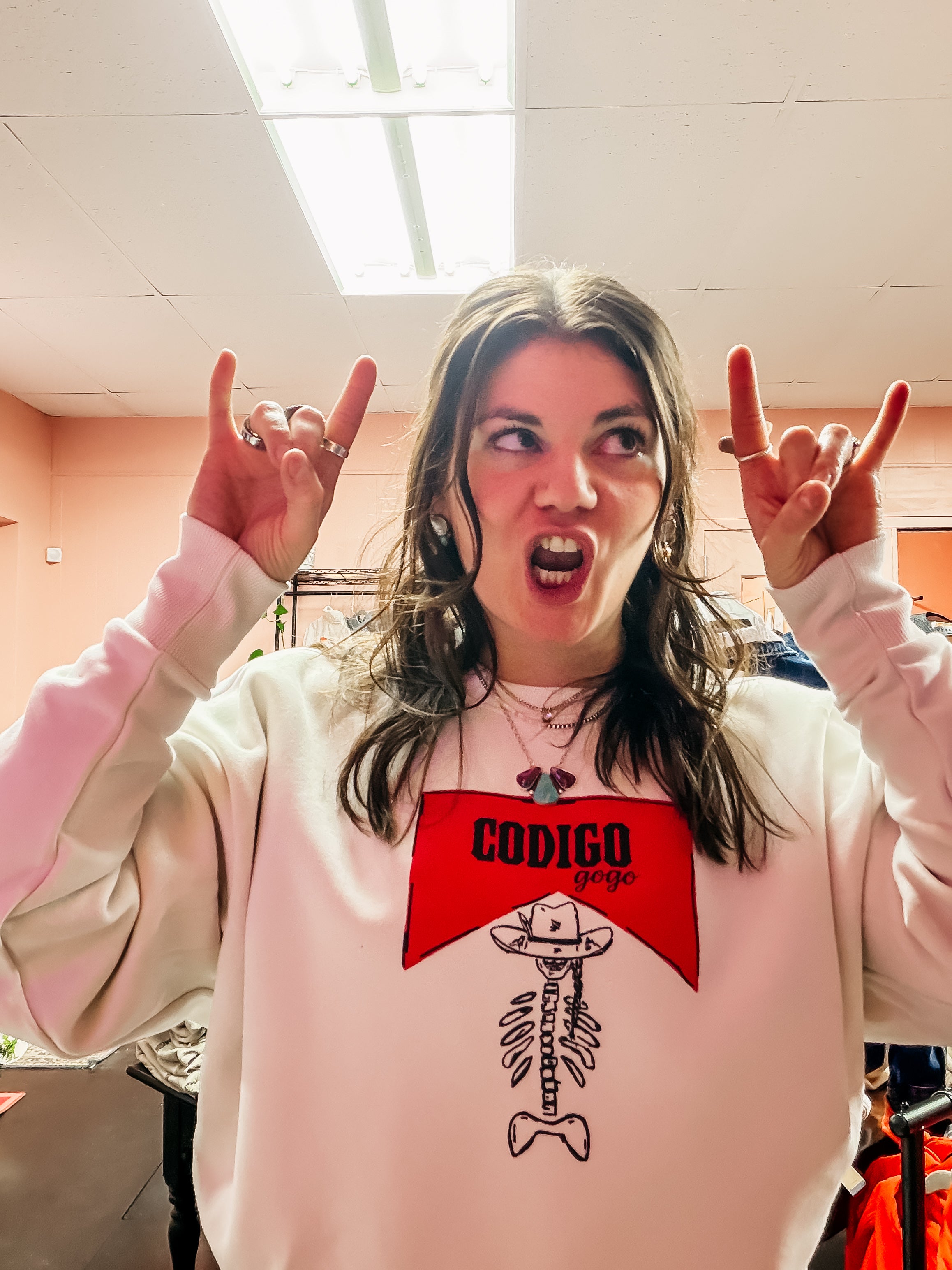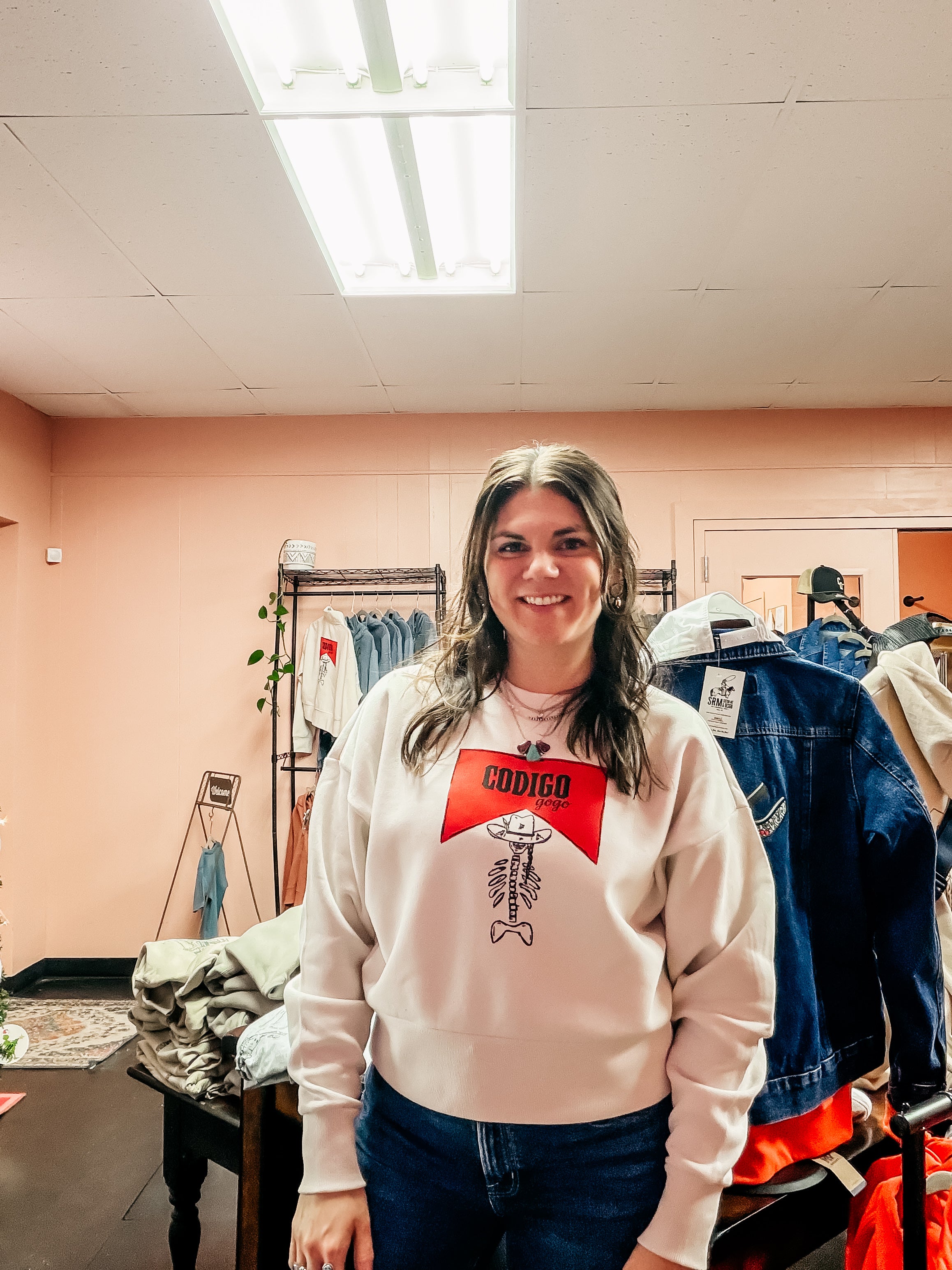 Tequila! These scuba-style crewnecks are made by Next Level and are the HIGHEST quality, featuring one of our most popular designs, the Codigo Gogo Cowgirl!