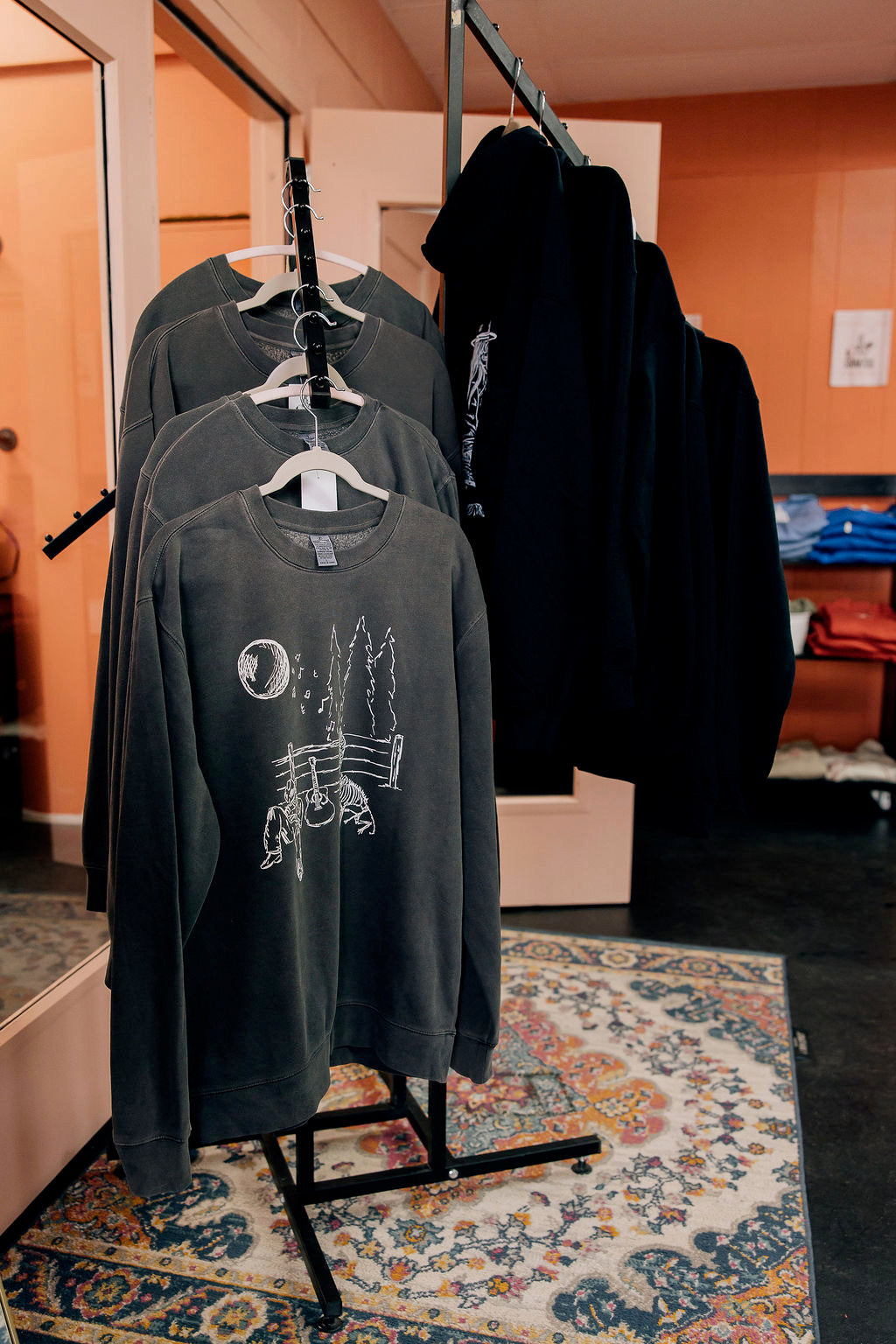LIMITED EDITION Coyote design in white on a distressed black crewneck made by Independent Trading Co. These are soft, unisex in sizing, and I can't wait to show you how I style mine. Let's think outside the box on this one, pals. Don't wait, I'm not keeping this design in the store.