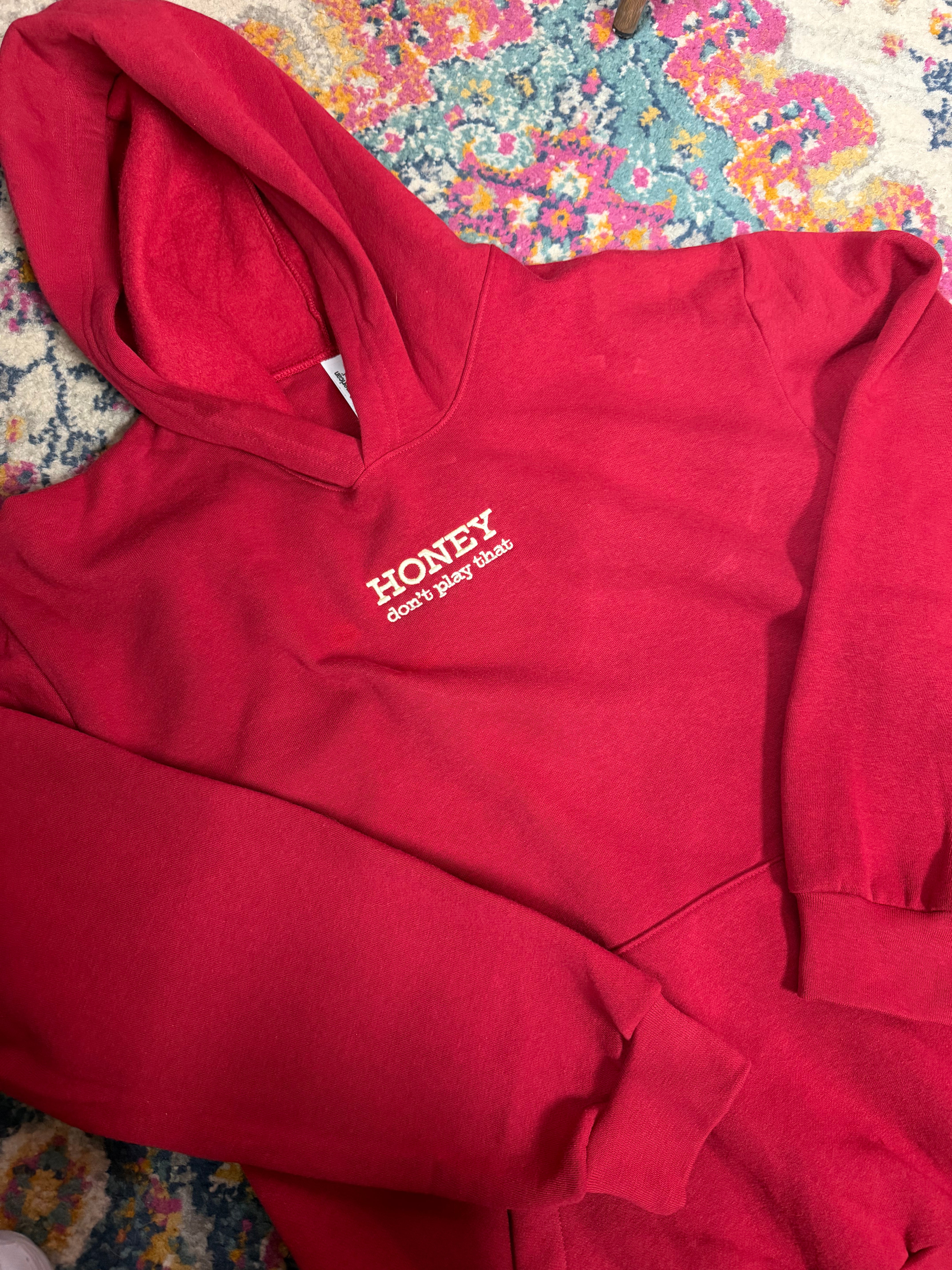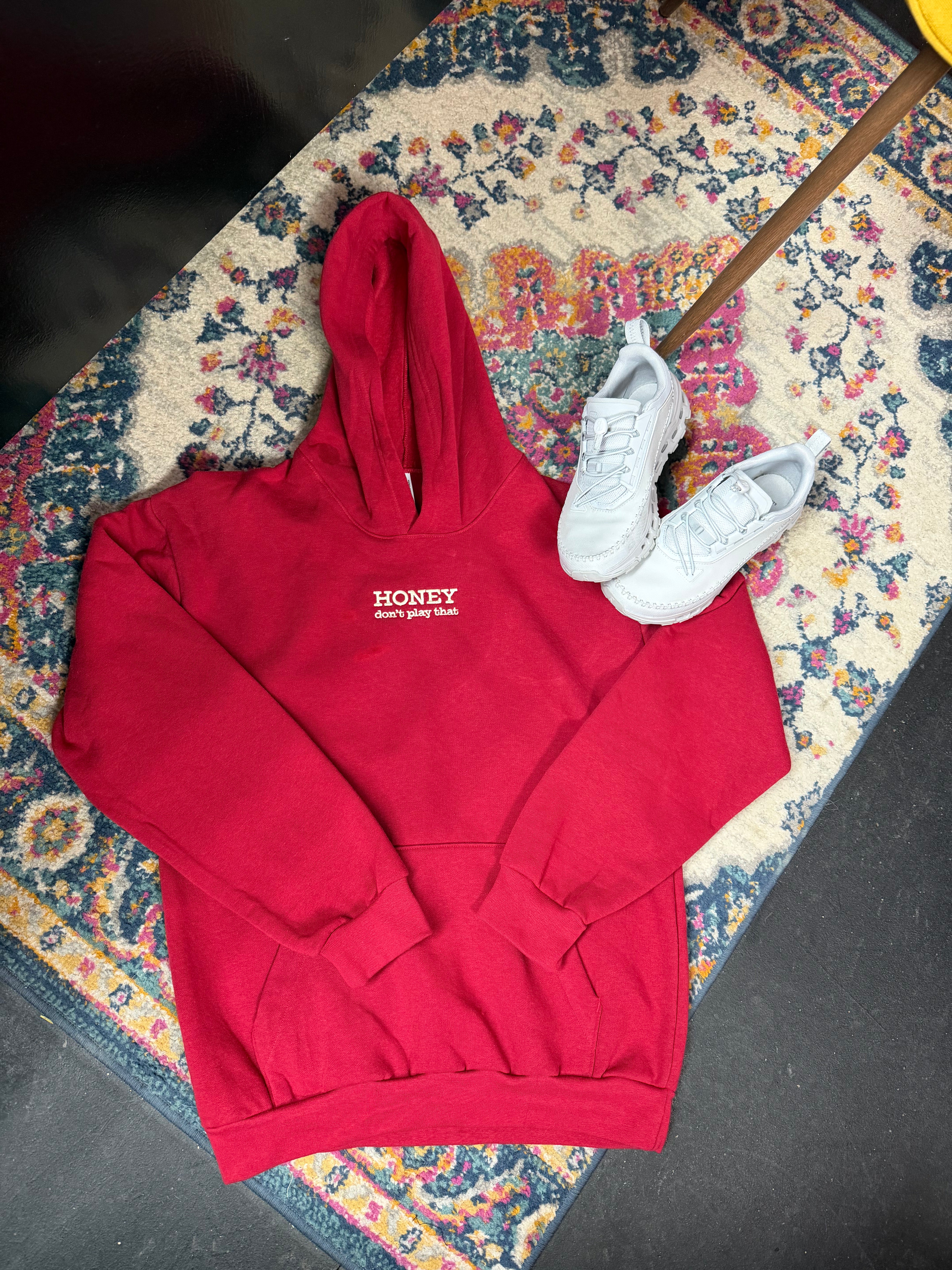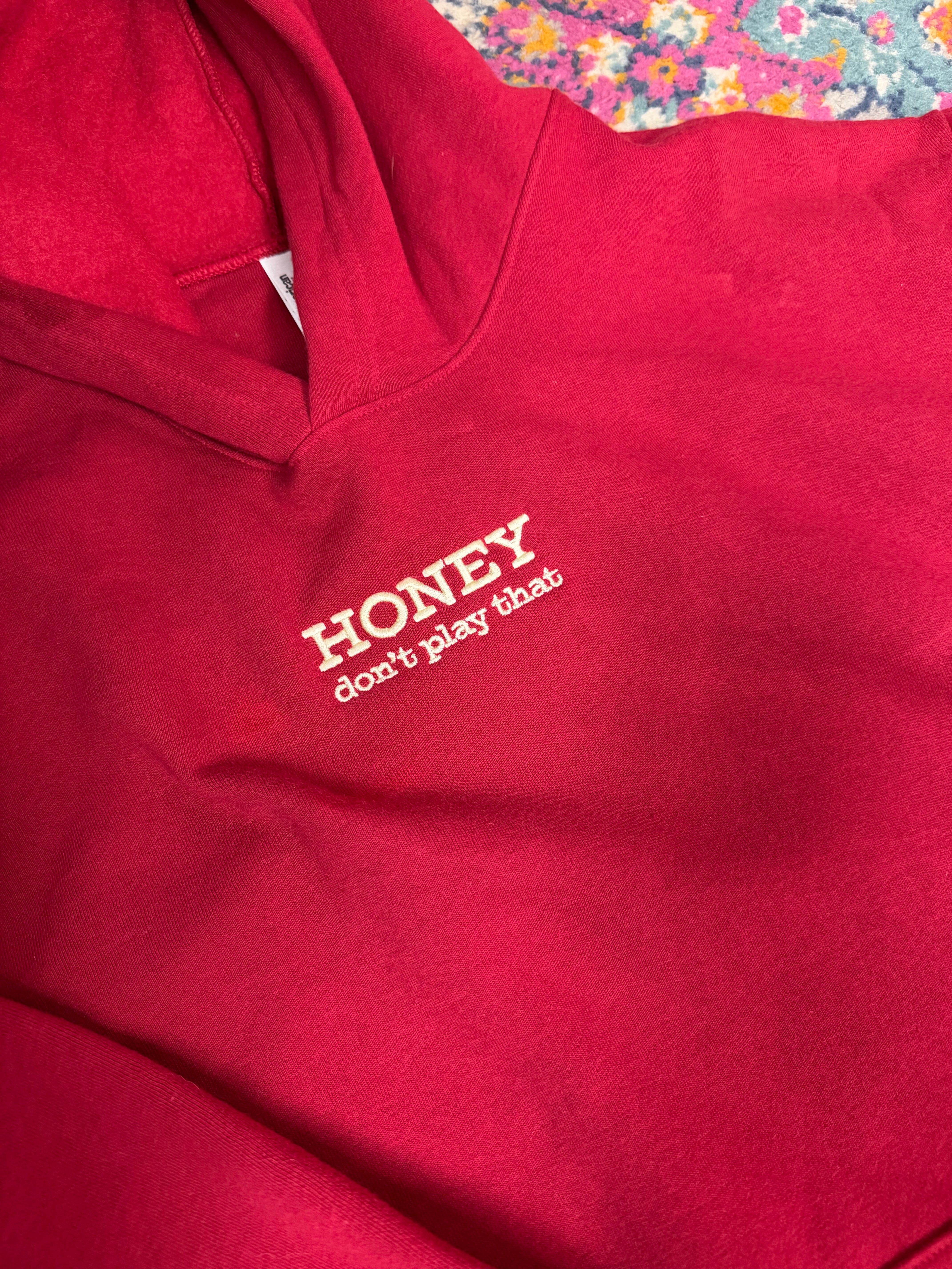 Super soft red American Apparel hoodie with "HONEY Don't Play That" embroidered on the chest. Super fun and sassy!!