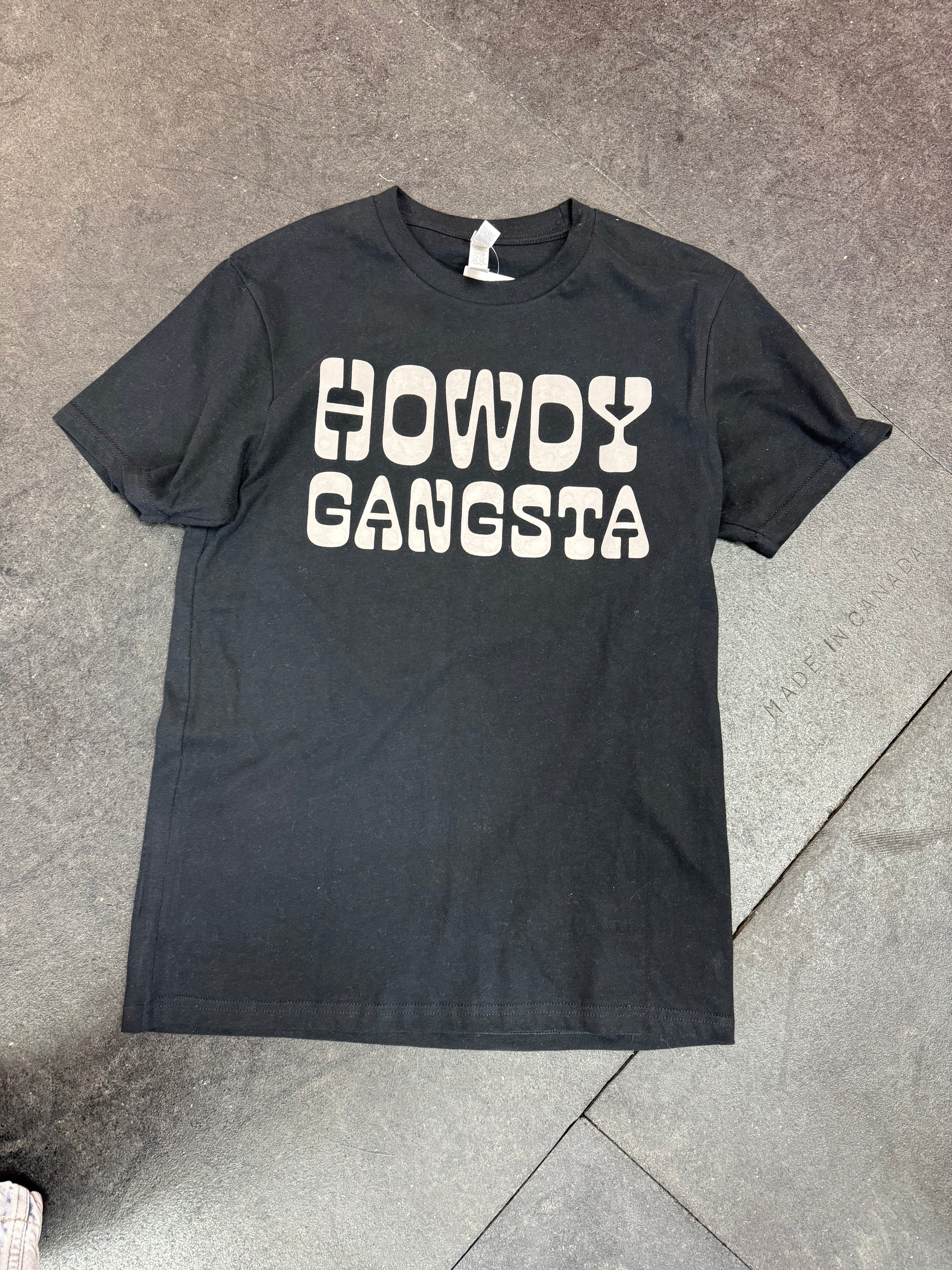 American Apparel Sueded Black Tee with Howdy Gangsta grey puff letters. This tee is so soft and perfect to layer and style up or down. I can't wait to see how you wear it! Don't forget to tag SRM :)