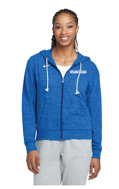 Nike womens zip up hoodie in royal blue with Trojans embroidered in white on front/left chest.